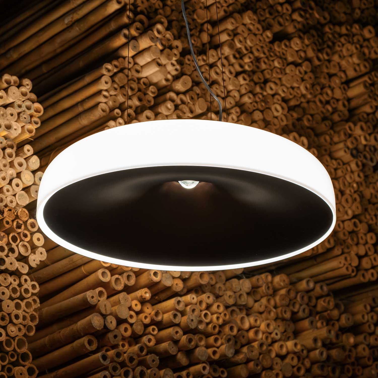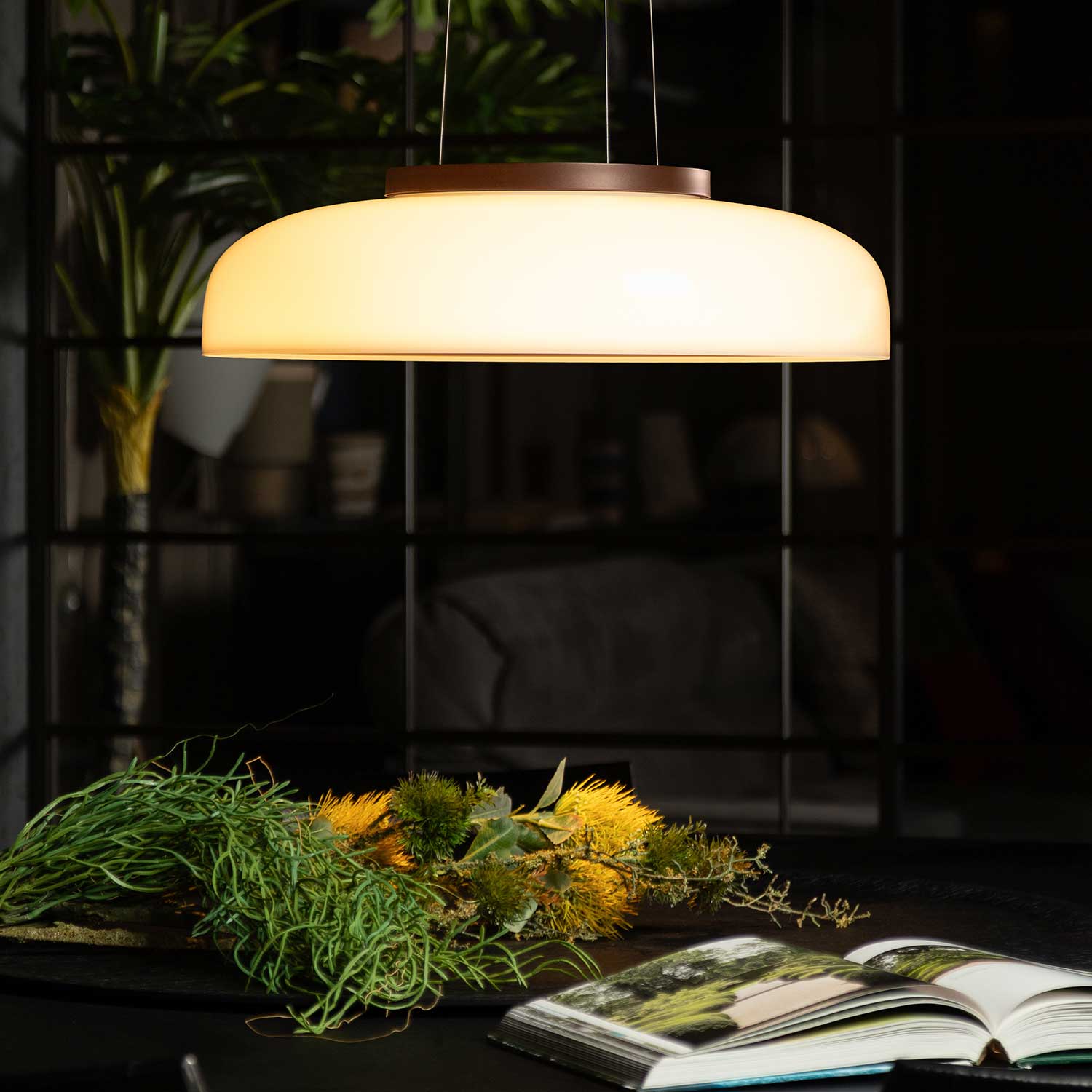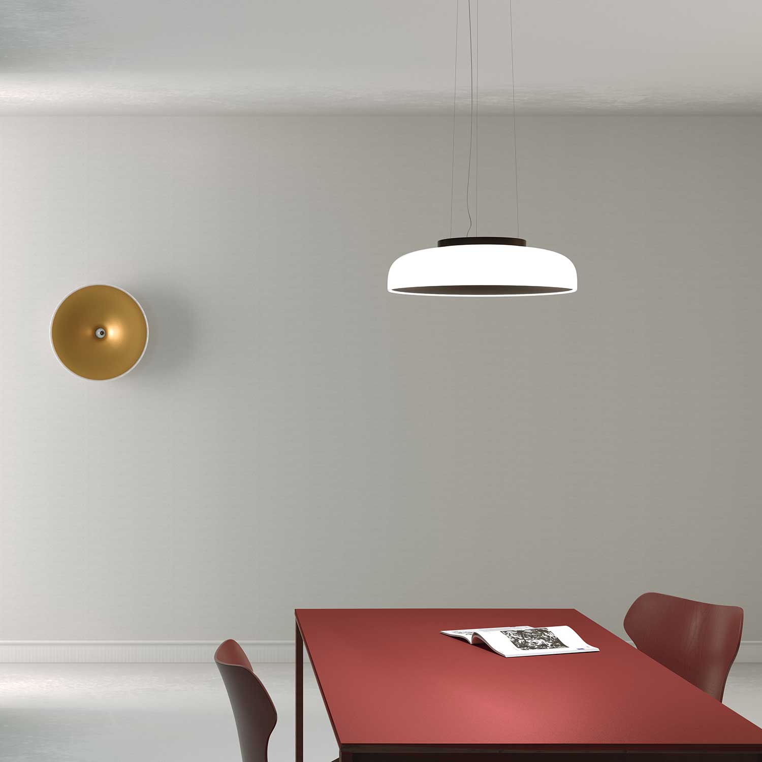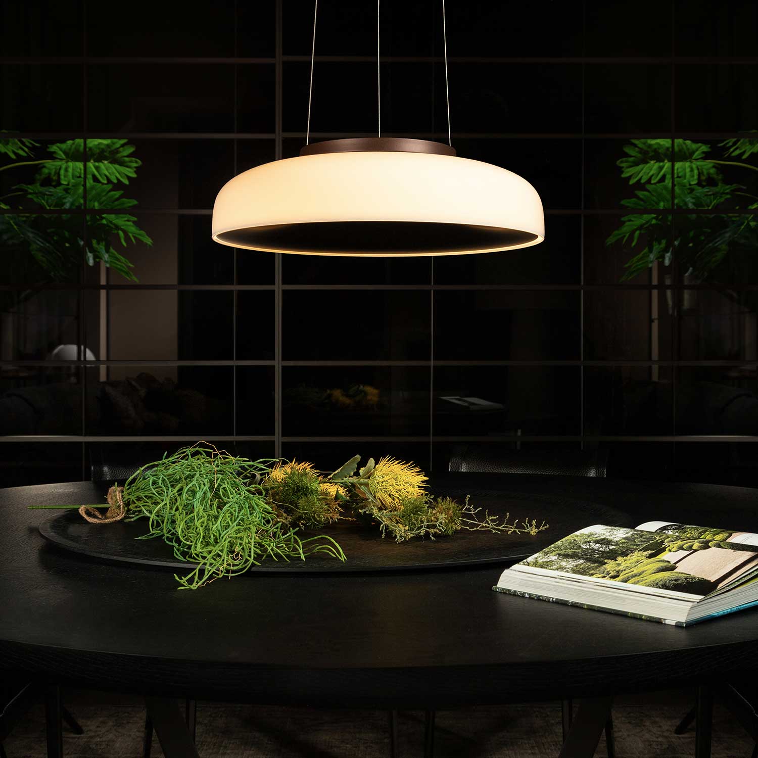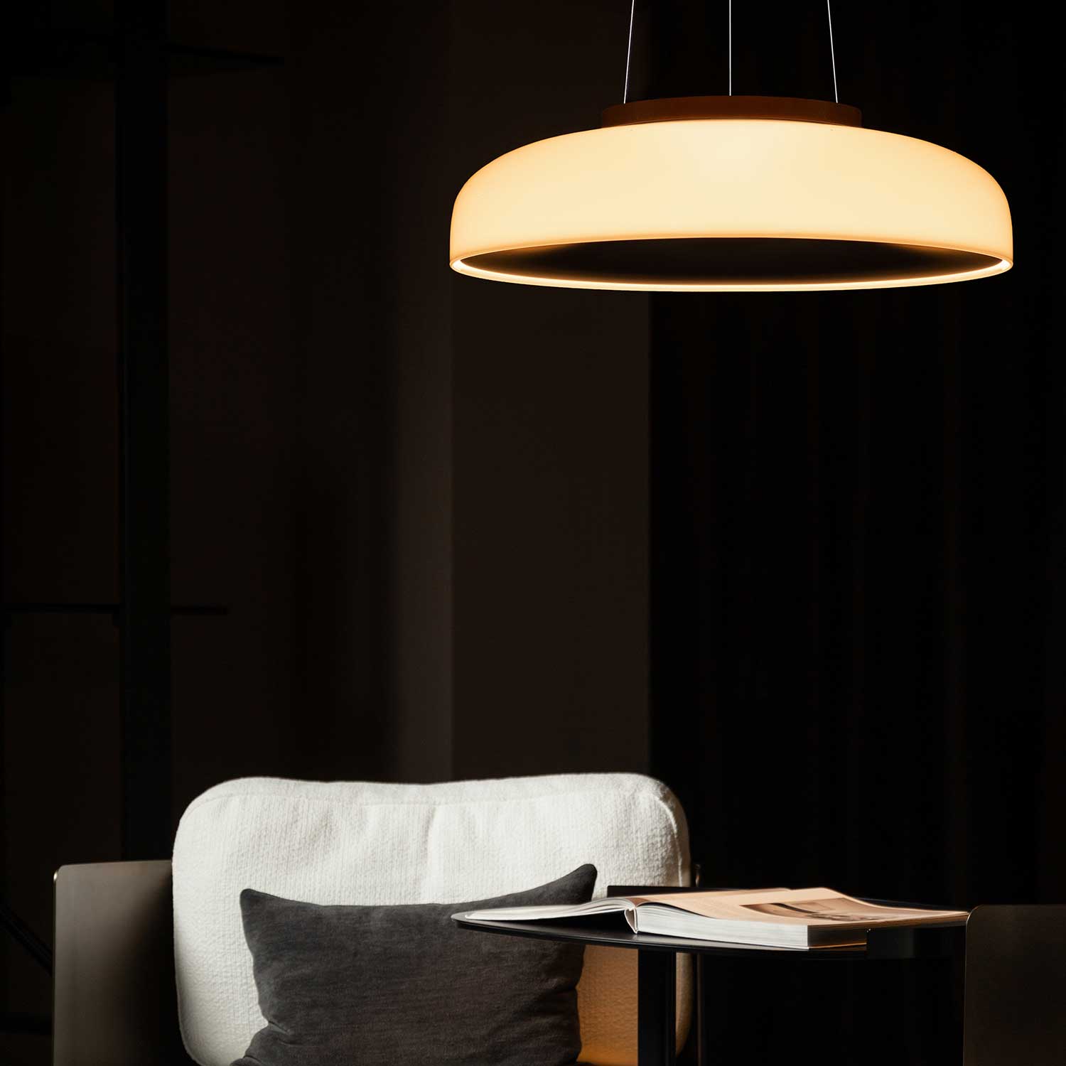 Det direkta ljuset strömmar nedåt från den centrala konen, medan ett mjukt, indirekt ljus reflekteras mot taket och skapar en behaglig balans mellan funktionellt och stämningsfullt ljus. Den trumpetformade metallen fungerar samtidigt som reflektor för den inbyggda LED-ljuskällan och tillför ett elegant visuellt element.