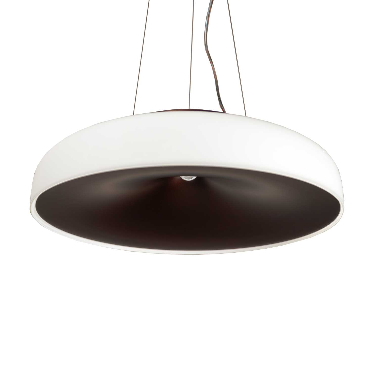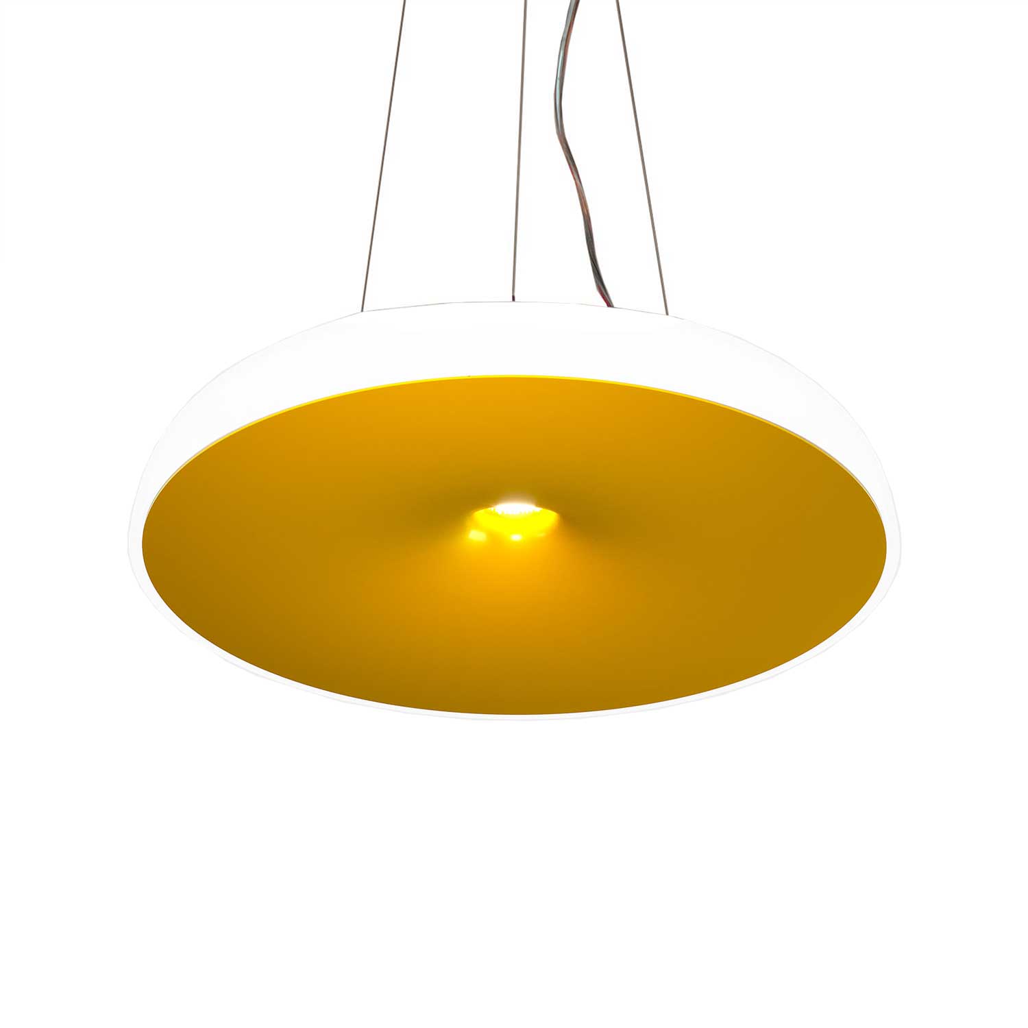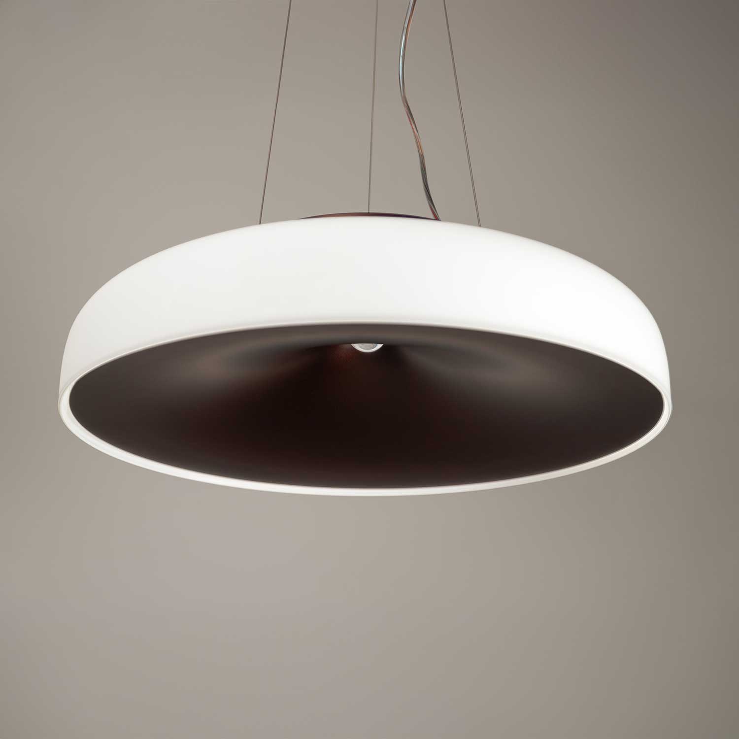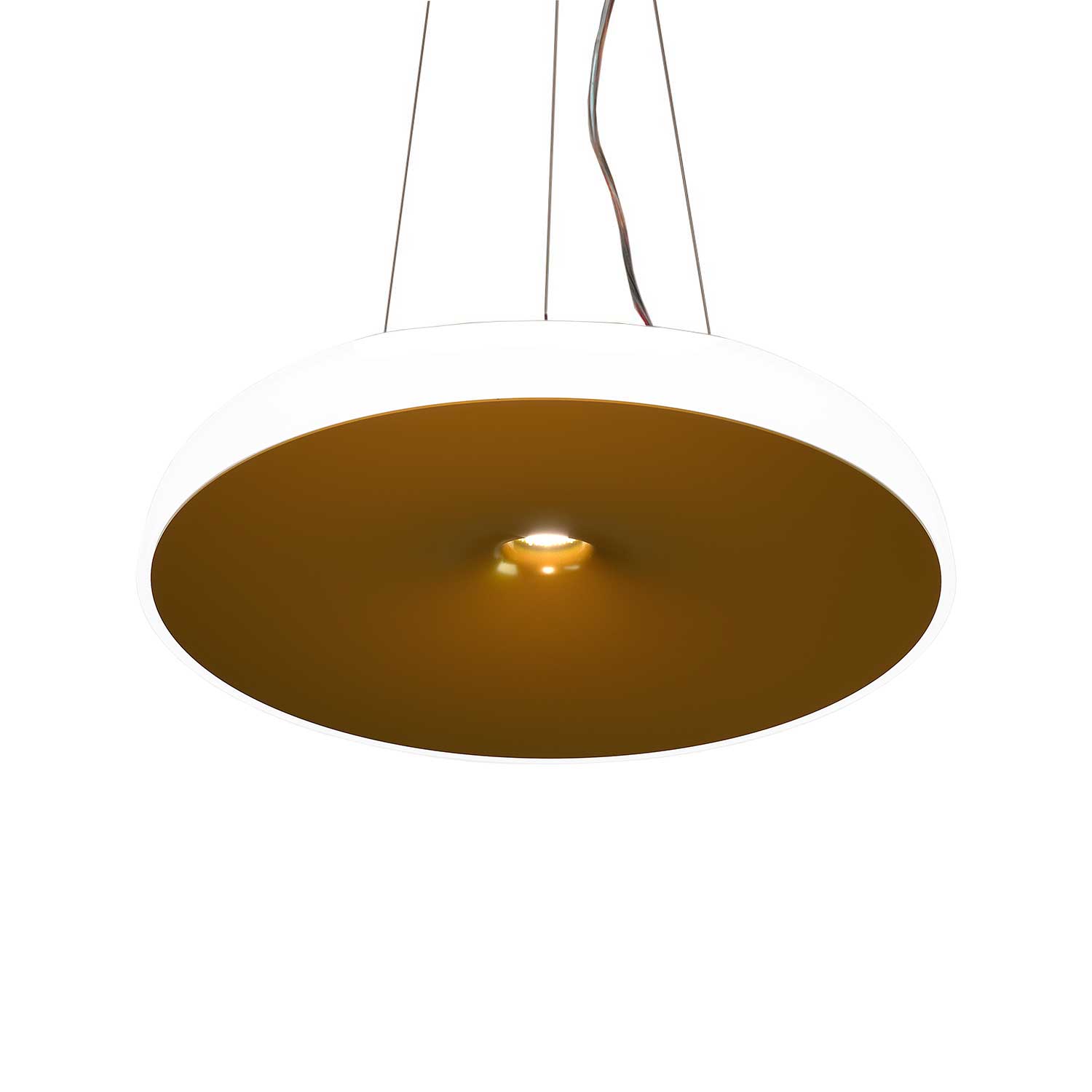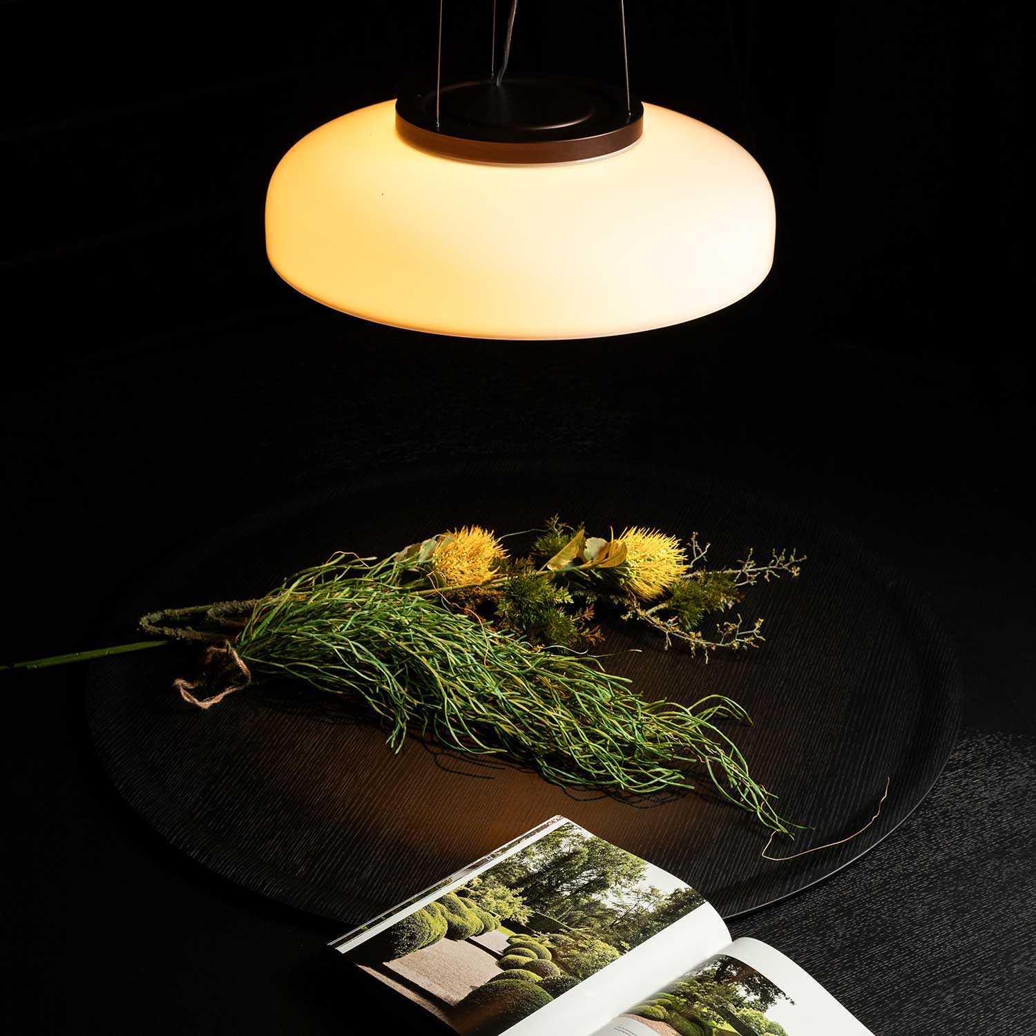 Det direkta ljuset strömmar nedåt från den centrala konen, medan ett mjukt, indirekt ljus reflekteras mot taket och skapar en behaglig balans mellan funktionellt och stämningsfullt ljus. Den trumpetformade metallen fungerar samtidigt som reflektor för den inbyggda LED-ljuskällan och tillför ett elegant visuellt element.